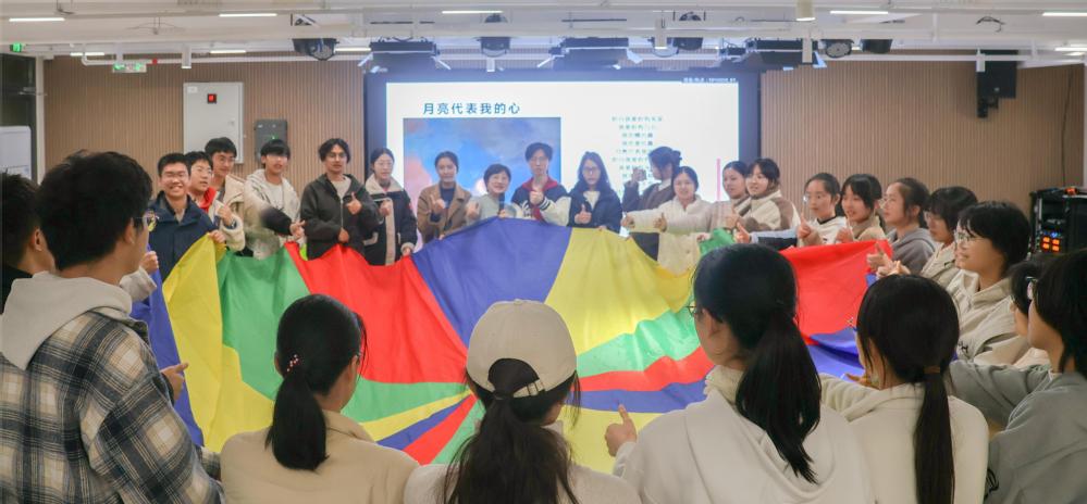 活动尾声,全体同学围起大圈、撑起彩虹伞,在共同舞动中齐唱《月亮代表我的心》,将现场气氛推向高潮。此次讲座不仅让同学们深入了解音乐治愈的魅力,更在互动体验中实现了心灵的舒缓与滋养。