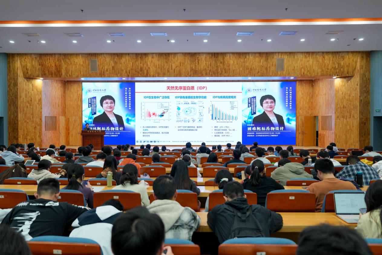 报告主体部分,来鲁华教授聚焦两类已成功开发为药物的困难靶标,展开详细讲解。其一是基于高保守高选择性别构调控的别构药物,其二是天然无序蛋白质(IDP)药物。她结合自身课题组的研究成果与行业内时效性强的典型案例,深入浅出地介绍了两类药物的开发模式、核心技术难点,以及人工智能(AI)在药物设计、构象预测、虚拟筛选等环节的辅助作用,让在场师生对困难靶标药物的研发逻辑与技术路径有了全新且深刻的理解。此外,来教授还分享了用于计算机研究蛋白质的计算工具与表征工具,进一步拓展了学子们的科研思路与视野,为后续开展相关研究提供了实用参考。
